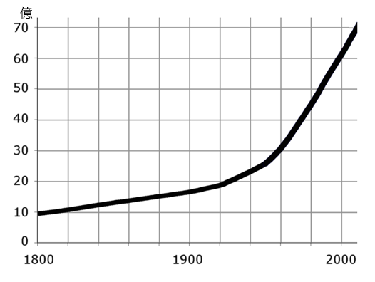 世界人口は,時に比例関数的,時に指数関数的に増加してきている。