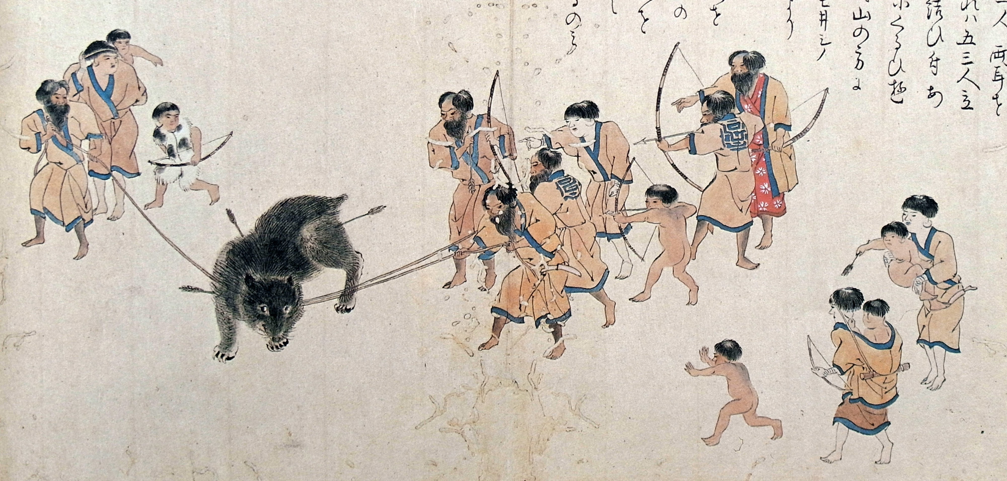夫より男夷は嬰子に至るまで、假に弓矢を製し持せ、先、其所の酋長の一男、文は熊を飼置家の子おして射初しむ。