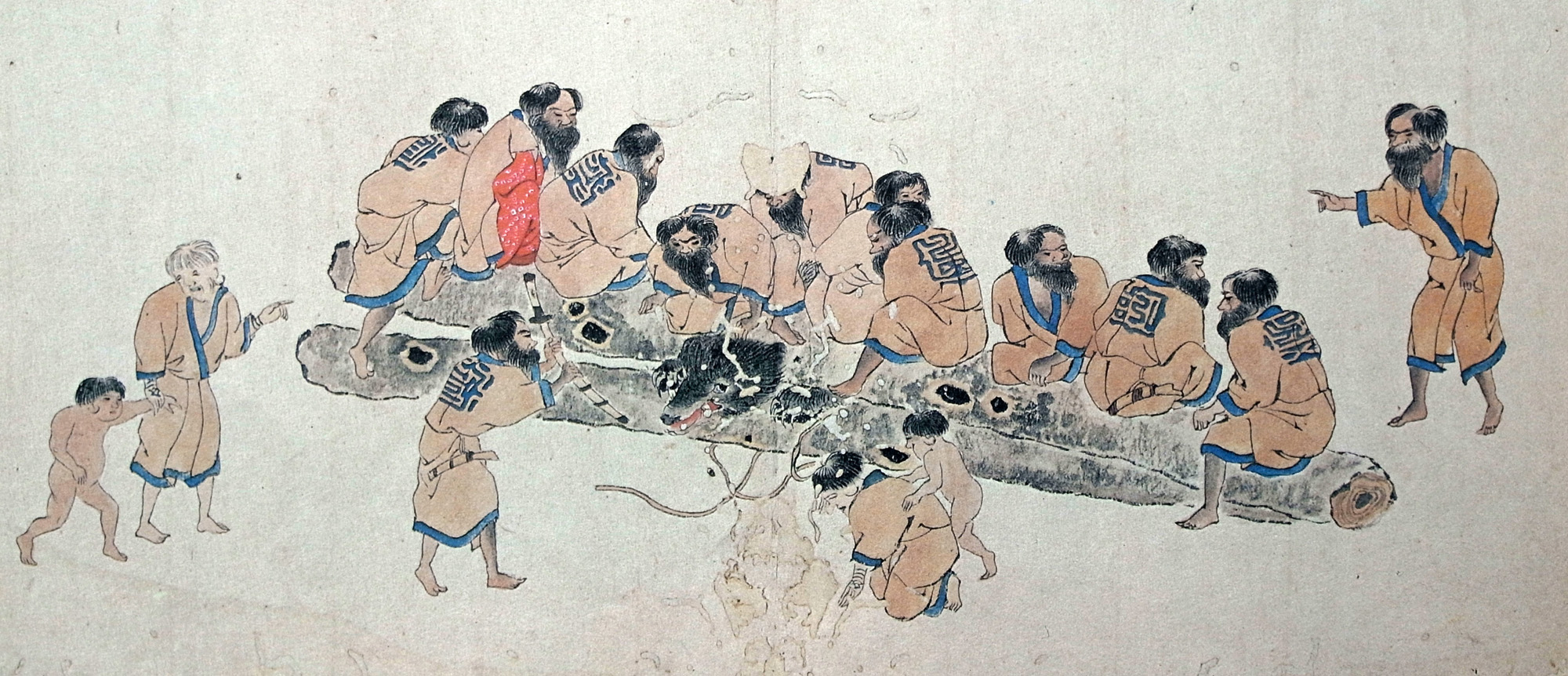 扨、殺したる熊を中央に置、夷服を著さしめ、耳環、又太刀を帯さしめ、酒食を供し、