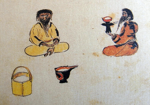 カモカモとて弦桶ゃうのものさしいだして酒こひはたり、提にうつし、ふたりうちむかひ居て、盞は台ながら左に把り、のせたる鬚上を右にとり,もろもろの神鬼をとなへつつ、かのイクハシウのうれして、そのみき露斗、いく度もこぼしこぼし捧ることひさしくて、鬚おしわけ、こゝろよげにのみて、此ひとつきのにごれる酒を、価なき宝にも、あにまさらめやとおもふならし、ゆめ、さかなもなう、さしかはして時うづりぬ。