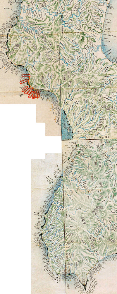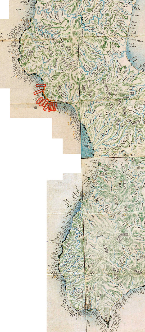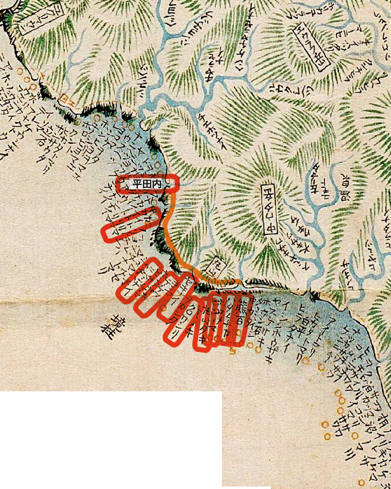 まづ寄木宇多、カイドロマ(貝取澗)、イシカイドロマ、キシノワシリ、チラチラ、あなま、ニビシナヰ,ふやげま、たきのま、タンネヒラ、ポンナイ、でけま、セキナヰ(関内)、くろワシリ、まるやま(丸山)、ビンノマ(便澗)、ポロモヰ、はたけなか(畑中)、熊石(久遠郡大成村より爾志郡熊石町熊石までの海岩集落)