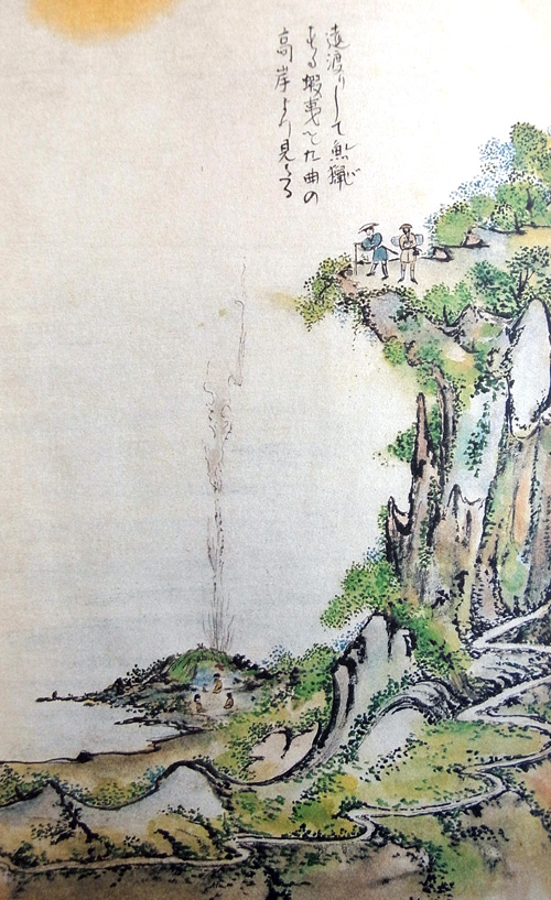 にいたりて、高岸に立のぞみて、みたにの底のやうに海べたを見おろせば、波よる岩の上に青草をひきむすびたる中より、煙の細くたちのぼるは、海士などの仮りに小屋して住むならん。