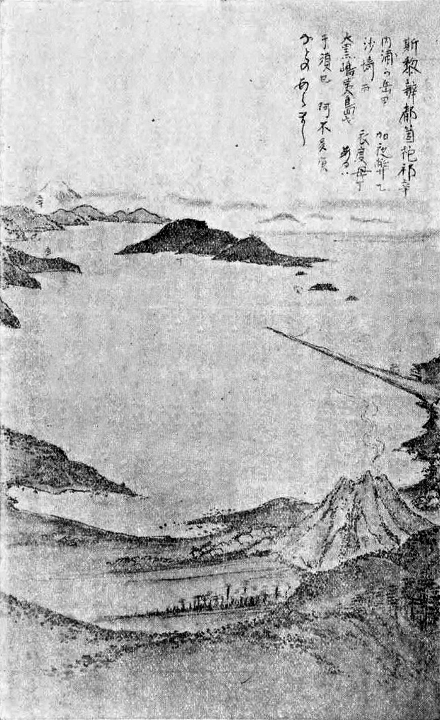 見やる沖の流れ洲のやうなる、布一むらを、うなゝかに引わたしたらんかとさし出たるを砂埼とて、エドモの浦(室蘭)に舟路のいと近し。