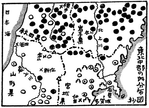 しかし地名が濃厚に残っていて、個々の語形や地形からも、また残った地名の特色の総合的比較からも、アイヌ地名地帯と、はっきり断定できる土地の南限は、宮城県の北辺から、山形、秋田県境に連なる線である、