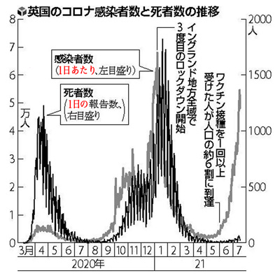 一方で、英国の全成人の7割近くがワクチン接種を完了し、 [1日の] 死者は 40〜60人に抑え込まれている。 政府としては、ワクチンの効果を根拠に英国の人口の約8割が集中するイングランドで社会活動の正常化を進め、 深刻な打撃を受けた経済の立て直しにつなげる考えだ。