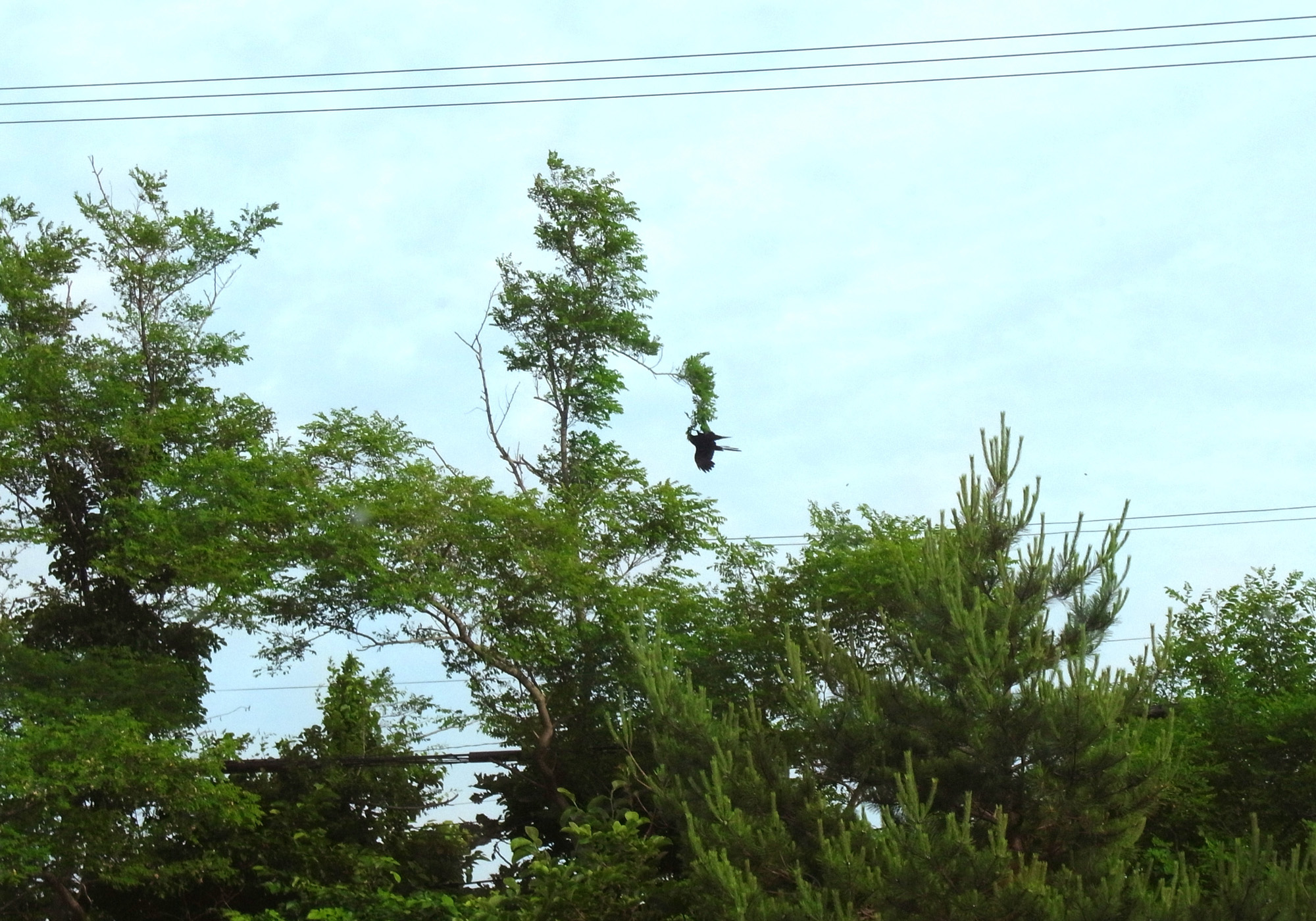 枝にぶら下がって遊んでいるように見えたが,つぎに電線に移動。