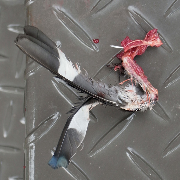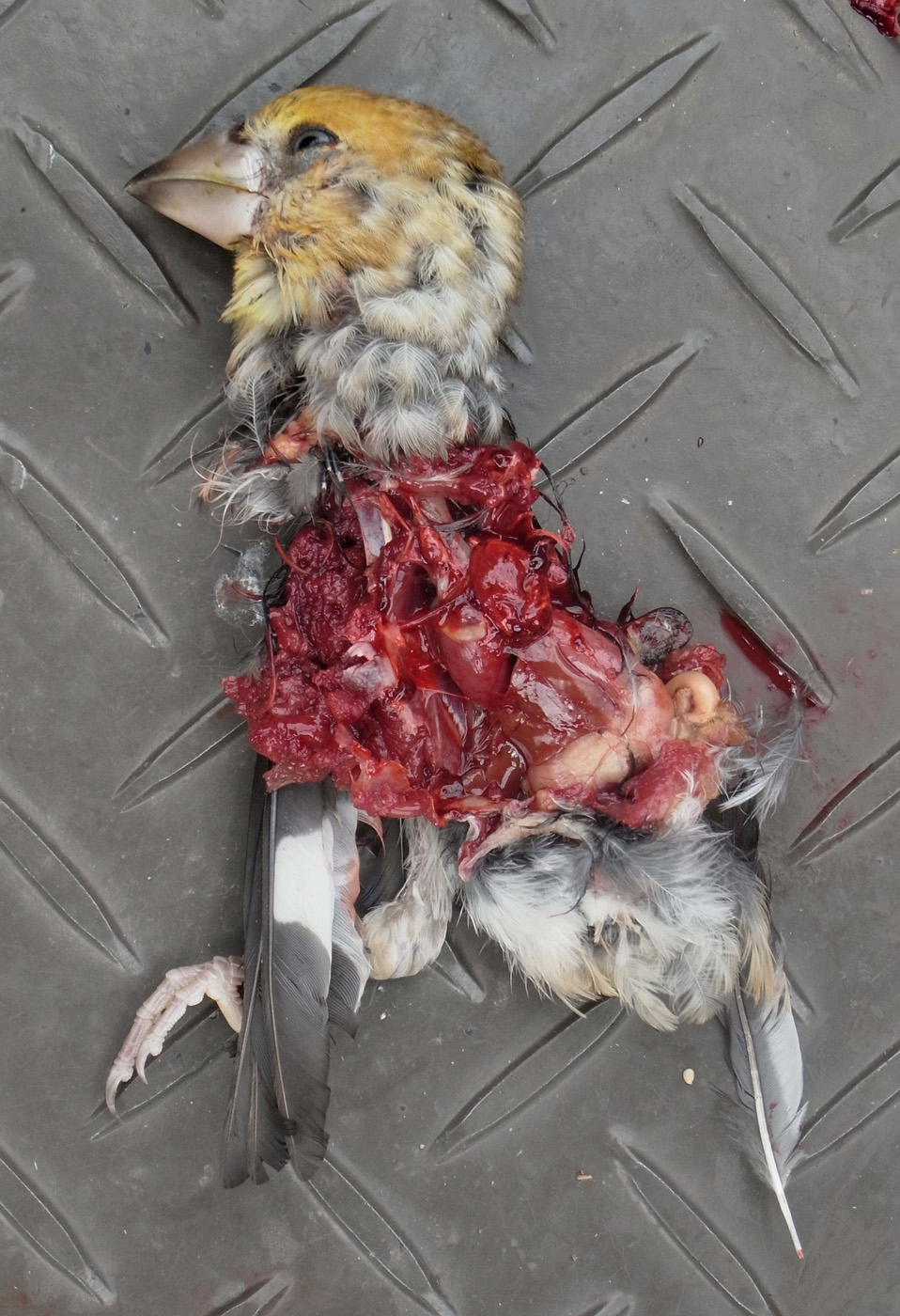 シメの雌と同定したのは,この死体の嘴の形状と,頭の色と,黒に白が入った羽根の色から。