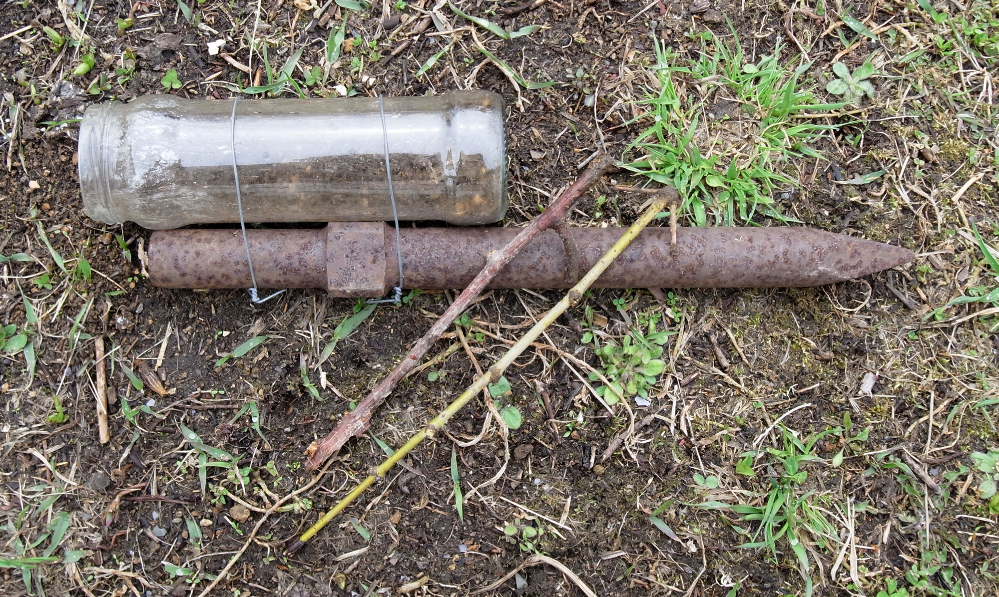 - 円柱形のガラス瓶──高さ18 cm,外径 5.5 cm──を横にして,重しを結わえる。
