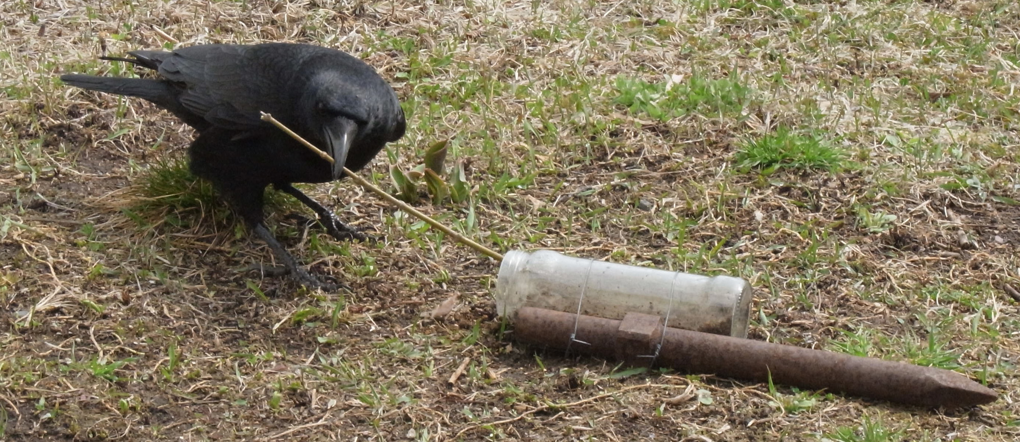実験は,《瓶の中の餌を枝を用いて取り出す》を学習するかどうかを調べるというものである。