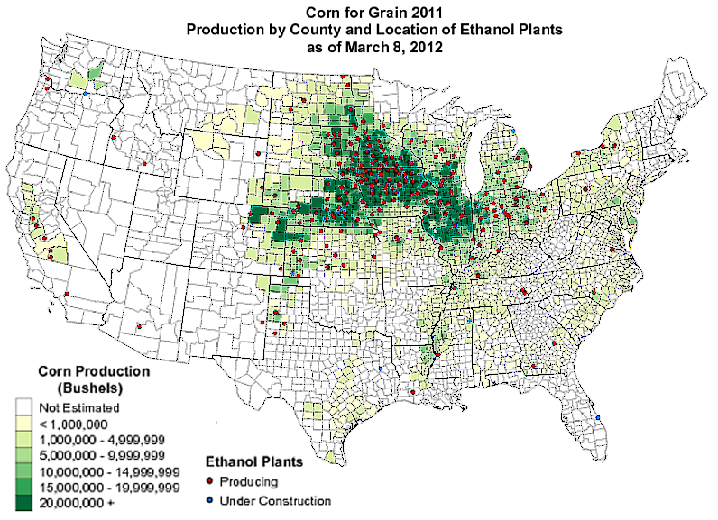 このトウモロコシ生産が,自動車のエタノール燃料をつくるためのものに変わってきた。 エタノール燃料の謳い文句は,"Green Energy Substitue for Fossil Fuels" である。 こうして,トウモロコシ産業は「地球に優しい産業」になる。 |