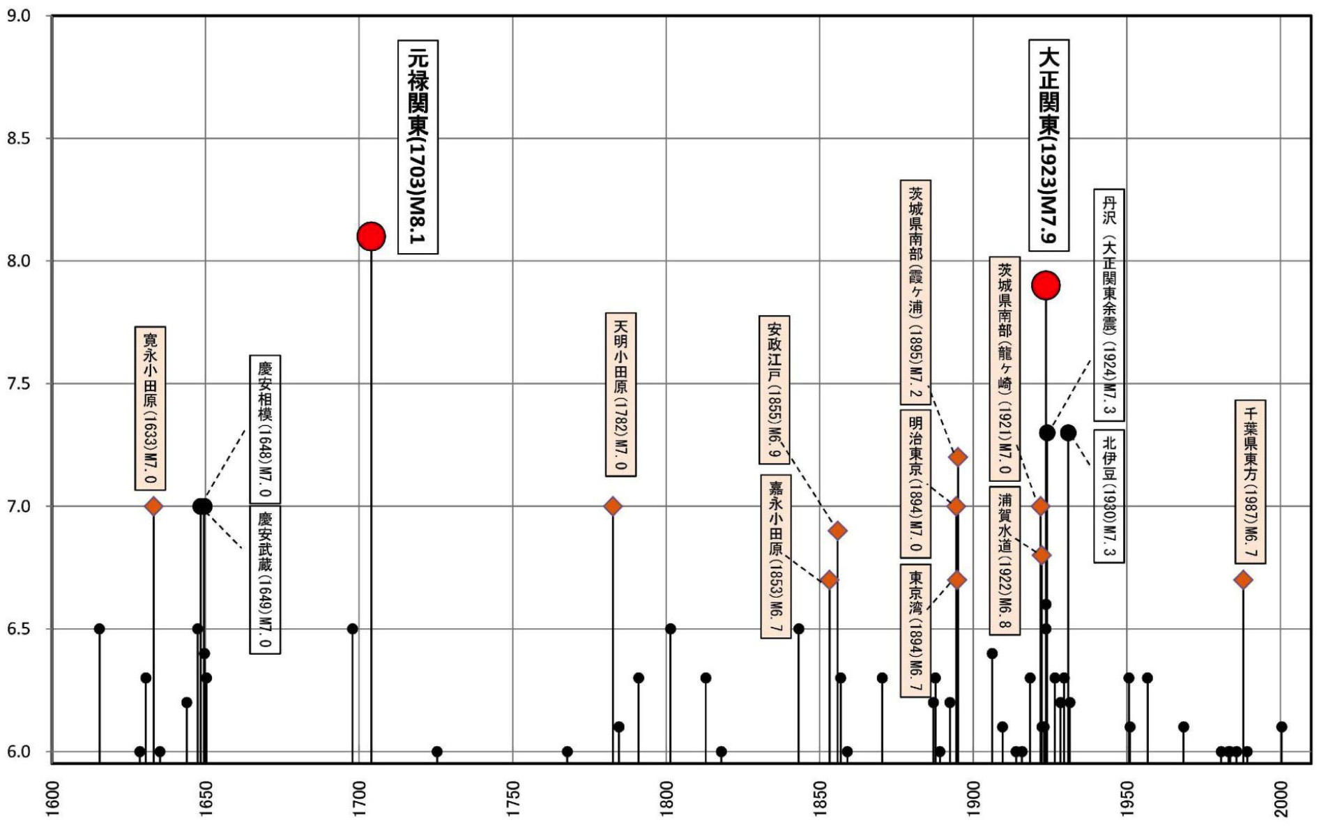 南関東で発生した地震 (M6以上, 1600年以降)