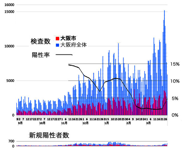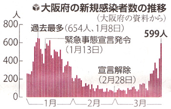 大阪府では3月31日、緊急事態宣言解除後で最多となる599人の新規感染者を確認。 宣言の発令に至った1月上旬に匹敵する人数となっている。