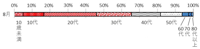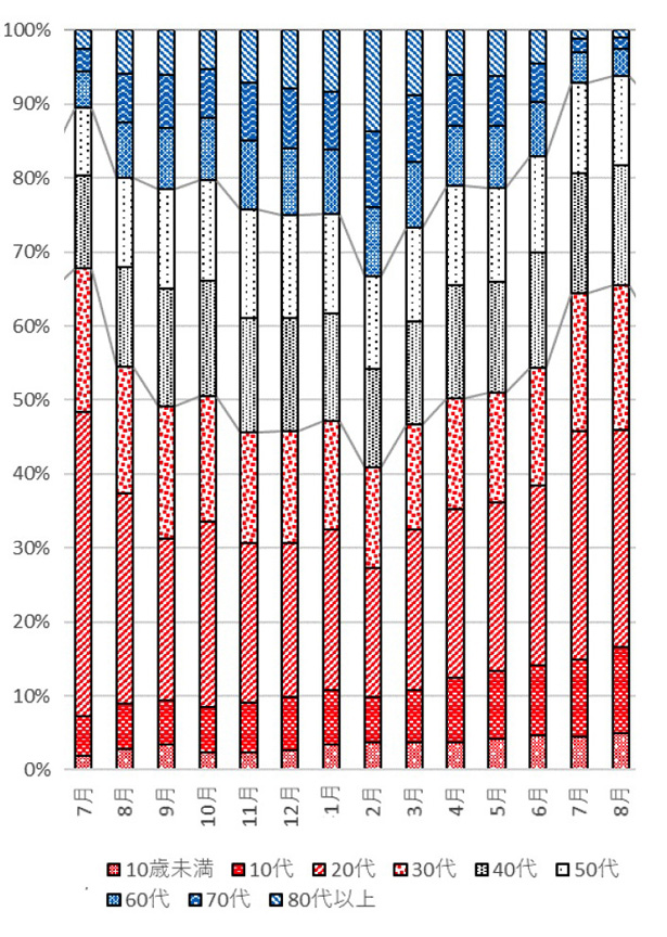 「被検査者の年齢構成」は,厚労省「新型コロナウイルス感染症の国内発生動向 (8月4日)」の中のつぎの「年齢階級別新規陽性者数の構成割合の推移」に示される年齢構成とほぼ同じと見てよい: