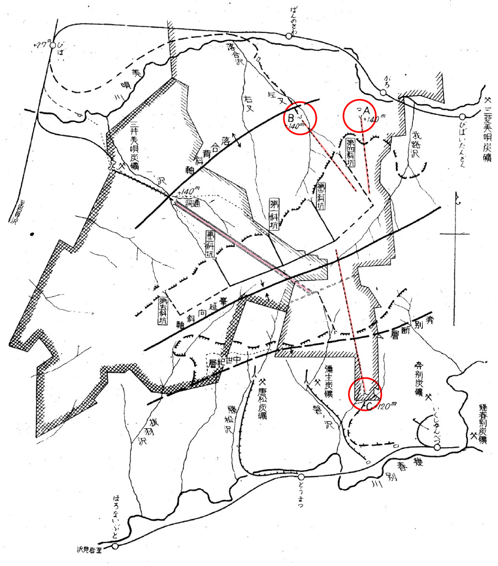 第3案 幾春別川支流盤の澤上流C點(海抜120米、省線準以上943米)に開坑し、向斜軸北翼部に着炭せしむれば,水準最も低下する利釜あるも,竪入の延長3,000米に及び甚だ長iきに過ぐる不利あり。