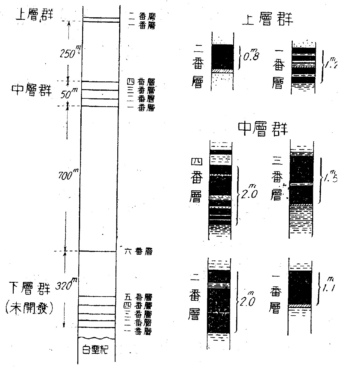 三井美唄鑛區中本計書により直ちに探掘し得べきものは,中暦群にして其主なるものは一番暦(1.1米) 二番暦(2.0米) 三番暦(1.5米) 及四番層 (2.0米) の4暦にして,何れも不粘結性の良質炭なり。