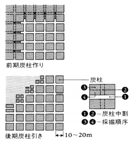 そして一定間隔で小坑道でつなぎ炭層を一定の間隔に区分し、それを一つずつ採炭 (払い) していき、幾つかの炭柱は天磐を支えるために残す「残柱式採炭法」がとられるようになった。