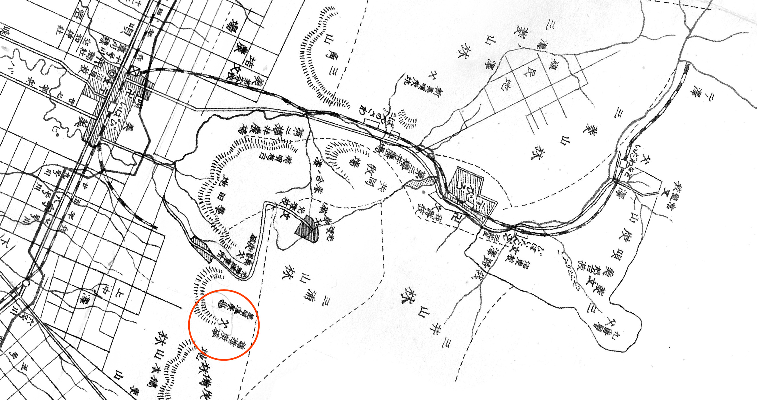 鉱区は,現在7丁目先の水源地の沢 (7号の沢) 一帯で,約50万坪余. 現在でも上の貯水池の両岸附近にその坑口が見られる。