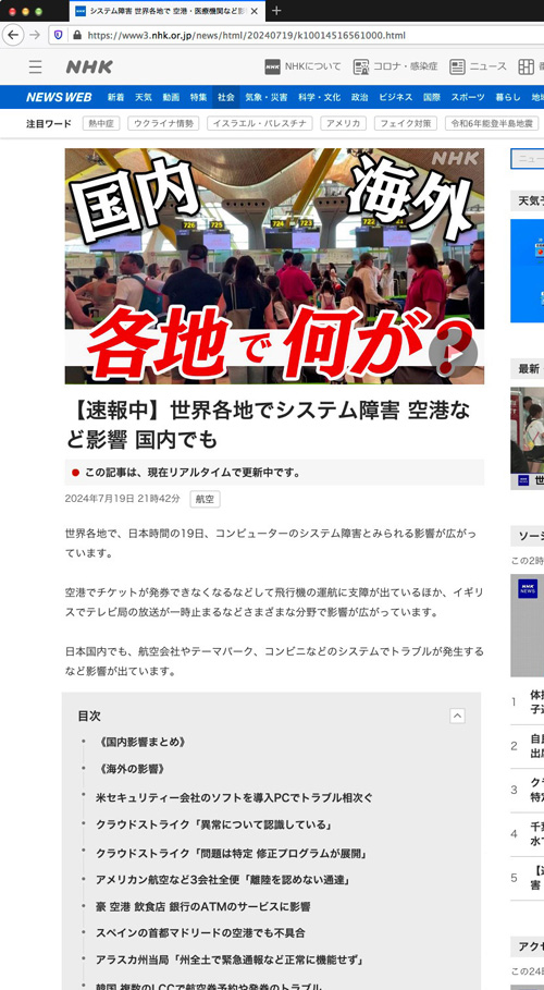 クラウドストライクの日本法人によりますと、19日午後、マイクロソフトのウィンドウズのパソコンが、勝手に再起動し、不具合が起きた時などに現れる「ブルースクリーン」が突然、表示されるトラブルが相次いで発生していることを確認したと言うことです。