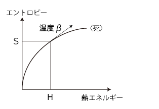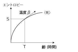 系の所与エネルギー (「エネルギー不変則」の謂う「エネルギー」) は,系の所与時間──「寿命」──と読みかえても,形式上問題は起こらない。 このとき「熱エネルギー」(エントロピー増大に既にシフトしたエネルギー) は,「齢」(これまで生きてきた時間) である。 要は,イメージの問題である。