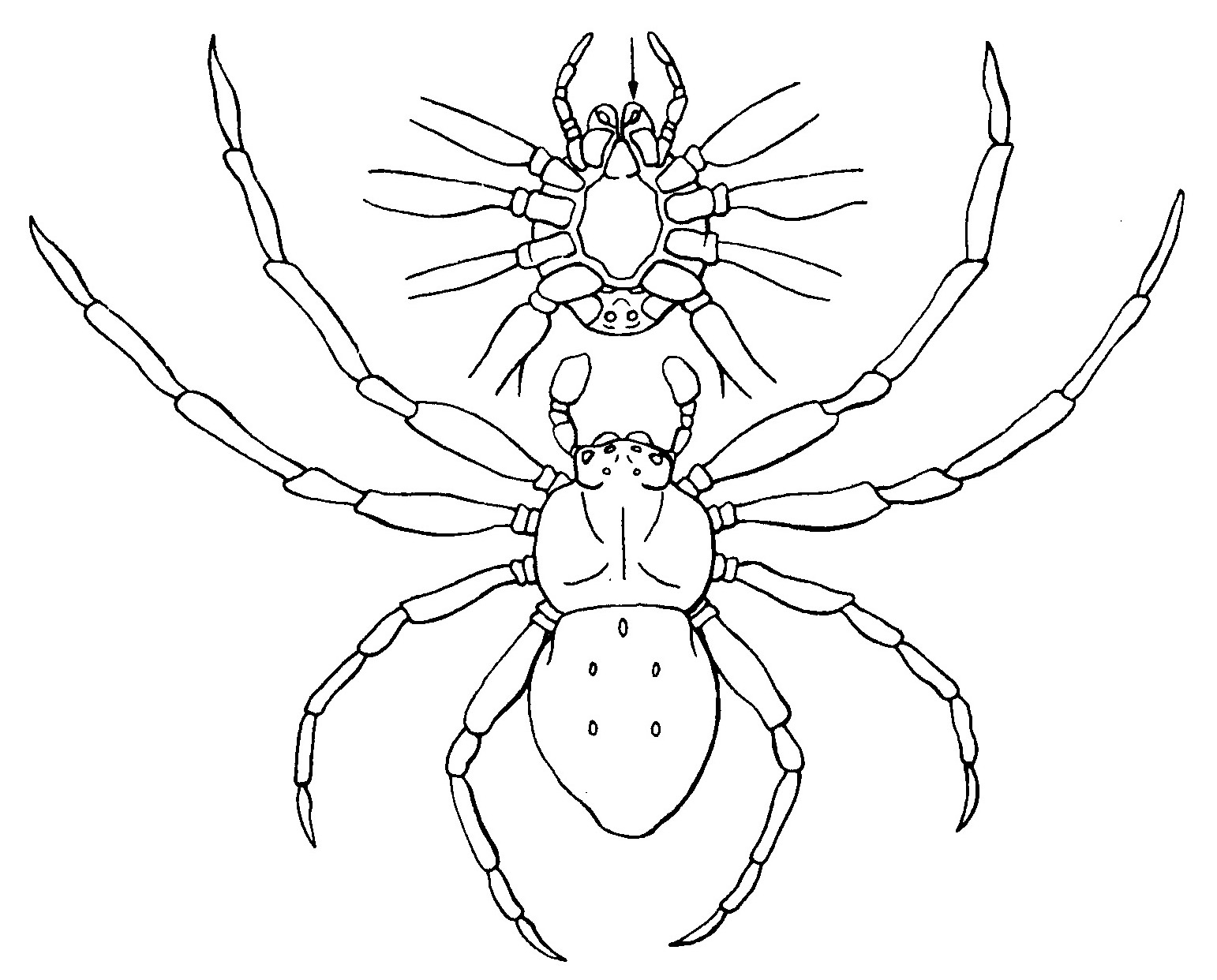 触角も大顎も無く,最前の付属肢は鋏角 (矢印) になっている