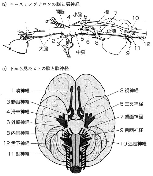 前節で魚とヒトの脳構造は共通だと説明したが、ユーステノプテロンのころには、すでに同じだったということだ。そして12本の脳神経は、この魚でもヒトでも、同じ順番で並んでいるのだ。