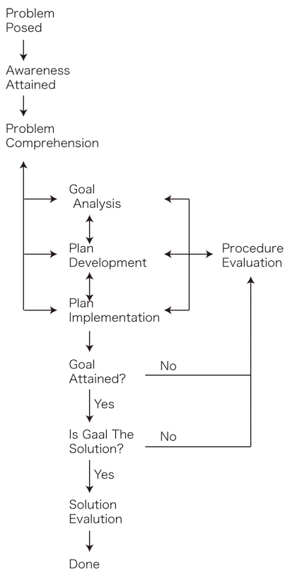 (Lester,1978,p.82) 2.4 メタ認知過程 問題解決過程にメタ認知過程を含める考え方が,ここしばらくの間,一部に定着してきている")。メタ認知論は,(メタ認知の存在身分の言及が必要になる)問題解決機制論においてほころびを呈するが,(存在身分の言及を無しで済ませることのできる)問題解決過程論においては,一応安全な論考でいられる。 例えば,つぎのような言い方をしている間は大丈夫である: In any kind of cognitive transaction with the human or nonhuman environment, a variety of information processing activities may go on. Metacognition refers, among otherthings, to the active monitoring and consequent regulation and orchestration of these processes in relation to the cognitive objects or data on which they bear, usually in the service of some concrete goal or objective. (Flavell,1976,p.232) Goal analysis can be viewed as an attempt to reformulate the problem so that familiar strategies and techniques can be used. (Lester,1978,p.80) (註) メタ認知を発想する理由は,つぎのようである: Procedures and solution evaluation may be viewed as a process of seeking answers to certain questions as the problem solver works on a problem. (Lester,1978,p.81) 3 問題解決機制論 3.1 問題解決機制論の概要 (1) 問題解決機制論は,合理主義的オリエンテーション下の論考である。特に,問題解決は"情報処理システムの問題解決"へと理想化される。