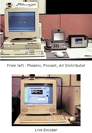 • 放送局では,Pixend でライブビデオを受信し,これを RealVideo(Progressive Network 社)Live Encoder 機にインプットする。Live Encoder 機は RealVideo サーバ機と TCP/IP 接続されており,RealVideo サーバはユーザからのリクエストに応じてライブストリームを送信する。