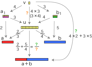 さて,数の和は 倍の和として定められます。 そこで分数の場合,つぎのようになります (倍は,長方形のヨコの長さに関する倍):