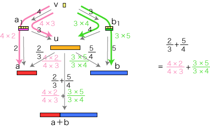 特に,(2/3)+(5/4) は,(4×2)/(4×3)+(3×5)/(3×4) になります。
