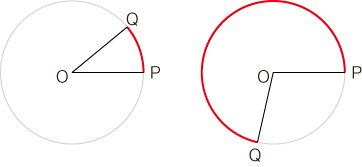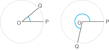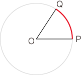 わたしたちの気持としては,つぎの青線で示されるものを「角度」としたいわけですが,この曖昧な青線を退けるところに「弧度法」の意味があるわけです。