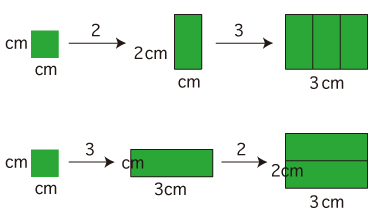このように,つぎが「文章題から数の積の式を立てる」のプロセスになる: 3.「タテ2cm,ヨコ3cm の長方形の面積は何 cm2?」 この問題は,「単位の倍の倍」のつくり方が2つある: