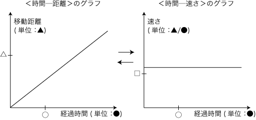 ![]() ヒントは,「等速運動の場合」である。 等速運動であれば,小学算数の比例関係の問題になる。 実際,小学6年生はつぎのことができる: ![]() さて,これがどんなヒントになるのか? 註:「等速」の<時間─距離>グラフが直線になるのはどうして?