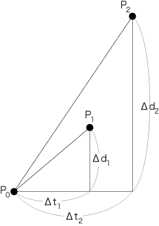 「等速」なので,Δt1:Δt2 =Δd1:Δd2。 これは,図の二つの三角形が相似(あるいは,直線P0P1 と直線P0P2 の傾きが同じ) ということ。 特に,3点P0, P1, P2 は直線上に並ぶ。 |