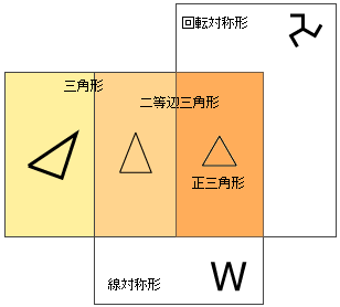 - 三角形の場合, 「回転対称」 は 「線対称」を含意します。言い換えると,「正三角形」は「二等辺三角形」を含意します。
