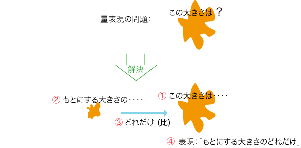 量の表現は,「この量は,もとにする量と比べてどれだけ」という形式で行います: