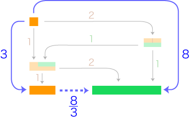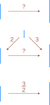 ![]() 小学校では「3/2」を「2つに分けた3つ」と読ませていますが,これは「左辺の量を2つに分けた3つが右辺の量」から来ているわけです。 つぎが,ここでの比表現の要点になります: