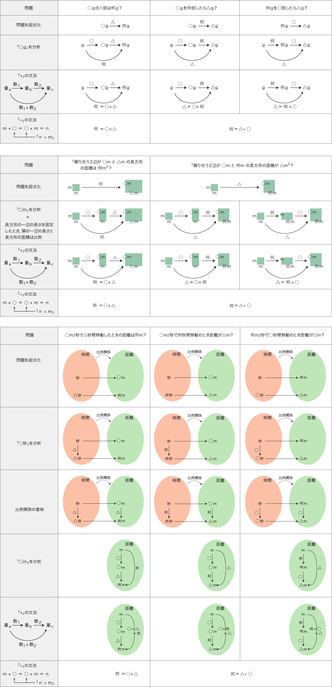 - 「○g (グラム) の△倍は何g?」の問題で,「何」に対し「○ × △」が立式される論理
