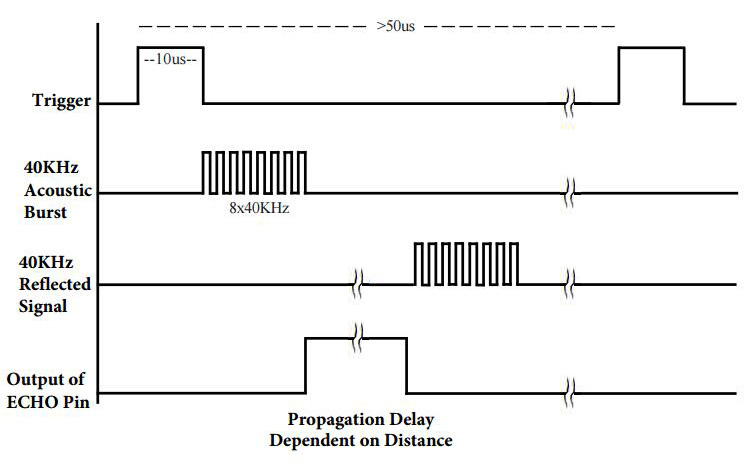 Trig がこれを受信すると,センサーの送信機は 40kHzで8サイクルの超音波信号を発信する。