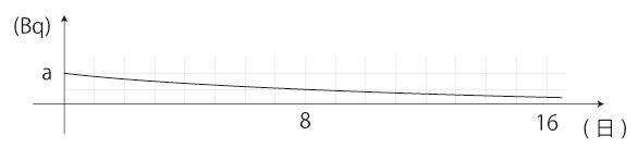 この中では,「半減期が8日なので,着実に減る」が,「ひとの<数量計算>の傾向と力量」の主題になってくる。 ──実際,「半減期が8日なので,着実に減る」は,放射能数値安全論が常套としているものであり,そして間違っている。 以下,「半減期が8日なので,着実に減る」の実際がどうなのかを,見ていく。 つぎは,「ヨウ素131は半減期が8日」を,初期値をaベクレル (Bq) にして書いたグラフである: