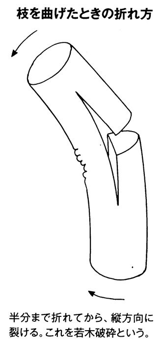 まだ乾燥していない枝を曲げると、外側の組織は引き伸ばされて、内側の組織は押しつぶされる。