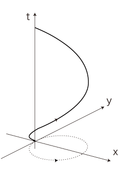 この絵の難点は,直線移動にしか使えない──t−x枠でしか使えない──ということである。 t−xy枠だと,見取り図ということになり,もはや解析の用途では使えない。──しかも,わけのわからない絵になってしまう: