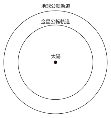 金星の公転半径は,\( 1.082 \times 10^{11} m \) 縮尺で書くとつぎのようになる: ![]() 金星が地平線から最も早い時刻に昇るとき,その金星の位置は: