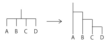 特に,系統樹が「分類」の絵図になった: ![]() 系統樹の縦線は,一つの種がずっと続いて今に至っていることを意味するのではない。 つぎのことを意味している: