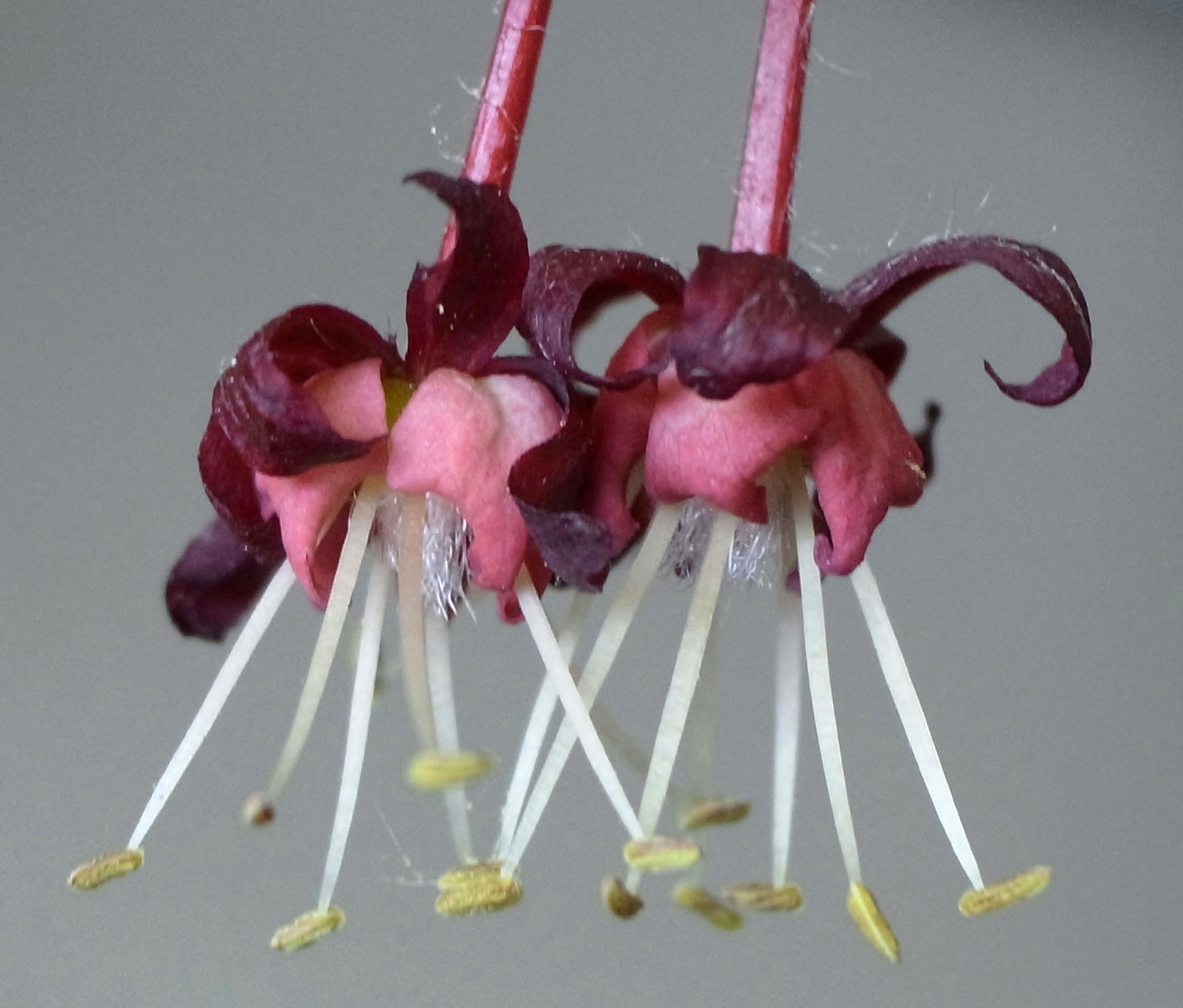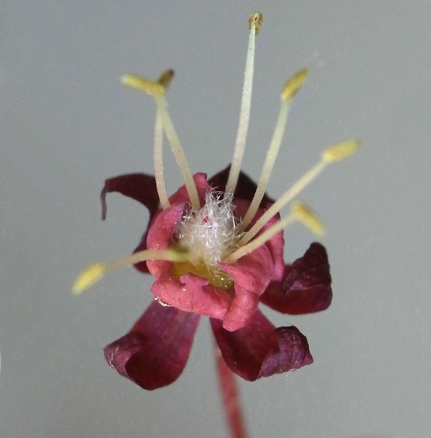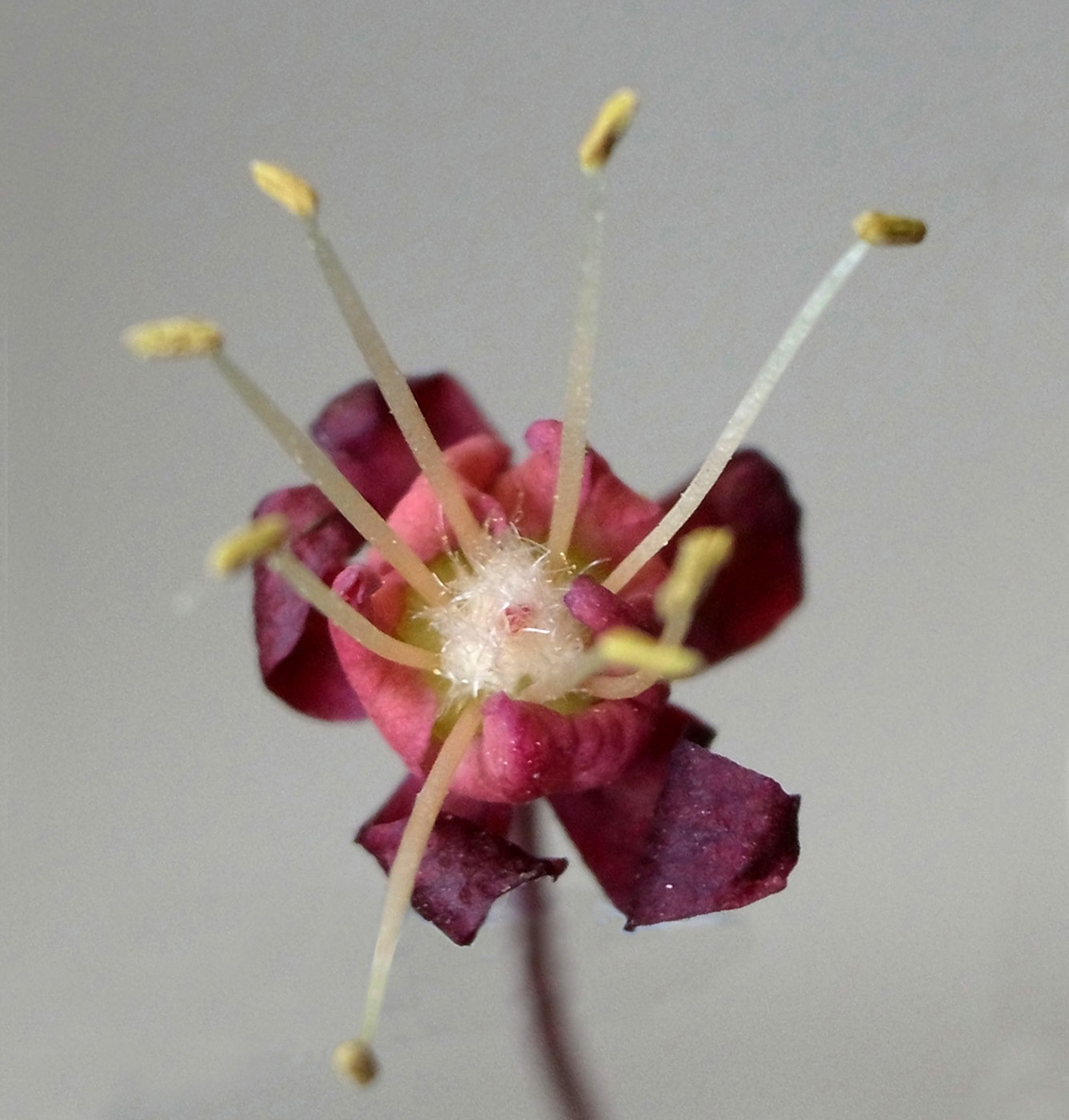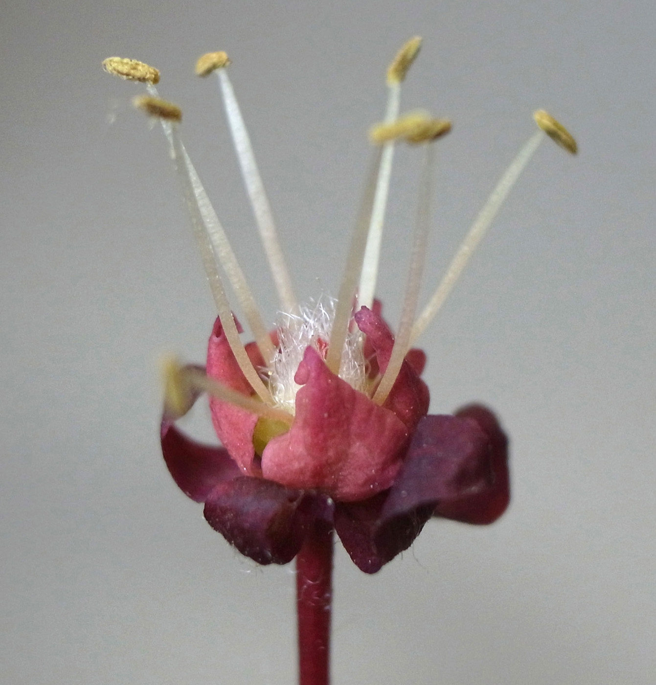 雌花 : 短い花糸をもつ雄しべが8本と,雌しべがある