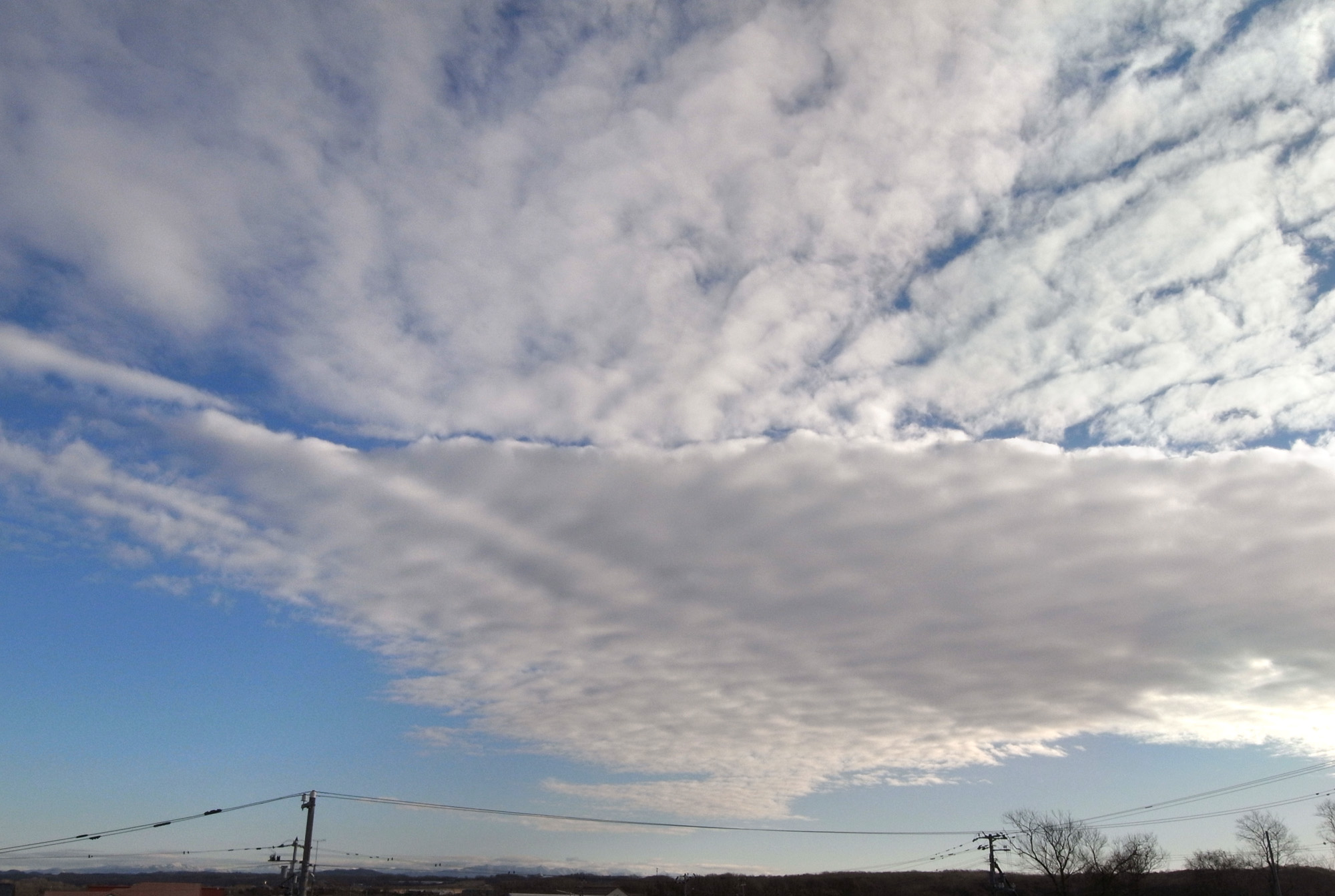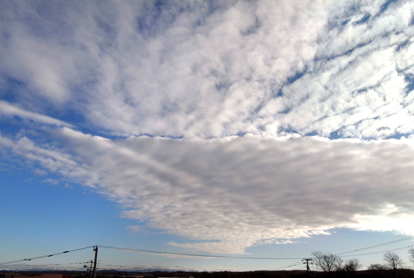 高層雲が広がり,その下の層積雲がちぎれ雲ふうになる