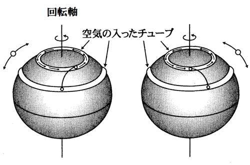 もし、このチューブが中緯度から高緯度に移動したとすると、あとで述べる角運動量の保存則により回転半径の縮まったチューブは東向きに回りだす。