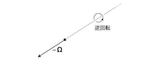 直進運動に対しては,「速度」を導入した。 円運動は,微分によって直進運動に表現されるので,直進運動の速度がこれの速度になる。 同様に,自転運動に対しても「速度」──「 即ち,自転速度Ωを,支点から無限遠点を見たときの自転の角速度 (ベクトル) ── 右回りか左回りか,単位時間あたり何ラジアンか ──で定義する。 そして,つぎのようにベクトル表現する: