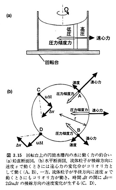 遠心力が働くにもかかわらず,容器内に外向きの流れがないのは, 水深の違いで生ずる内向きの圧力傾度力が遠心力と釣リ合っているからである.