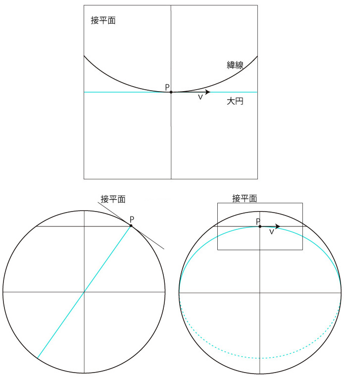 球面上の移動の速度は,大円に沿う。