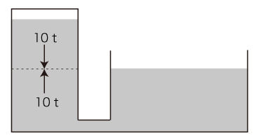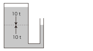 10トンの水銀柱は上向きの10トンの力で支えられている。 パスカルの原理により,この上向きの10トン/m2 は,管の右側にも現れる。 そしてそれは,下向きの10トン/m2 と釣り合っていることになる。 この下向きの10トン/m2 を, 「大気圧」と考える。 |